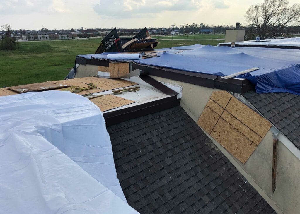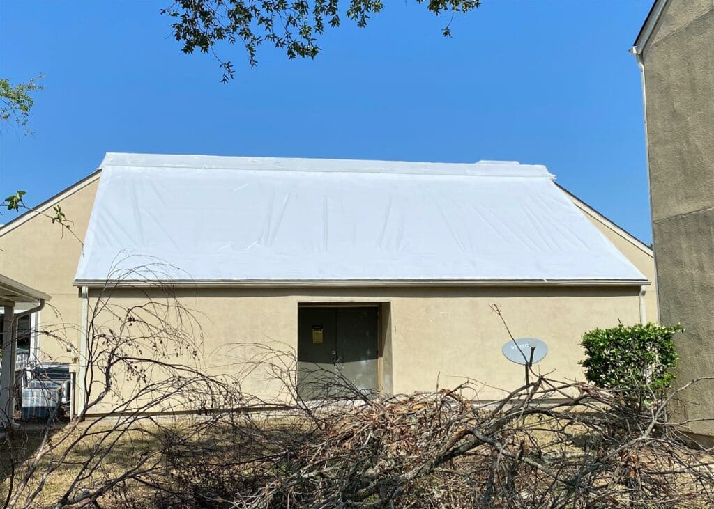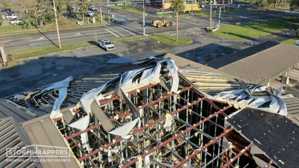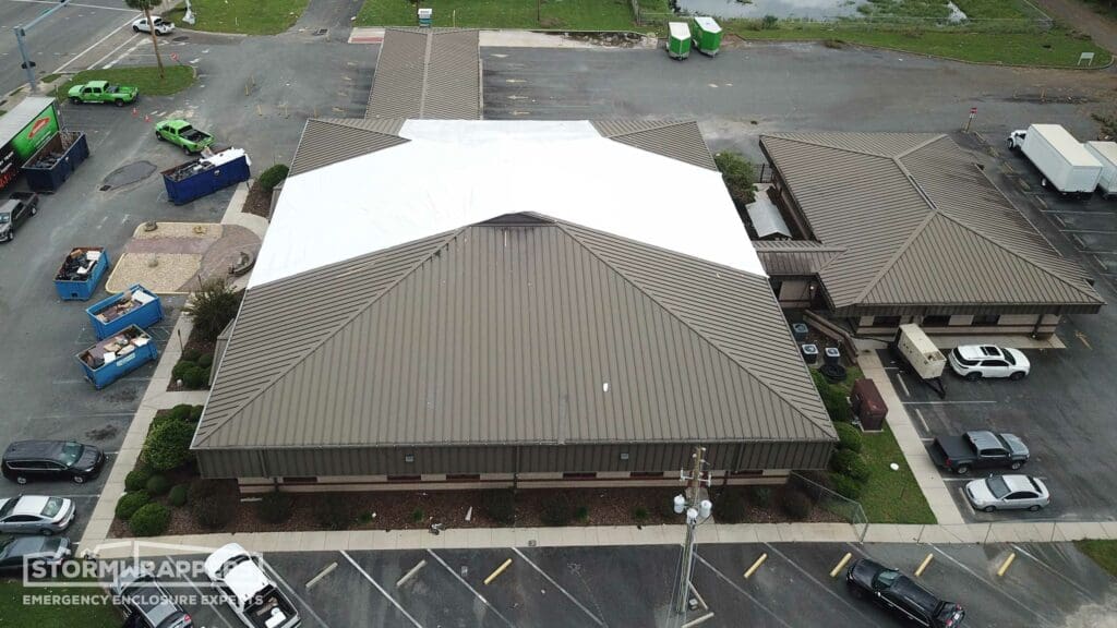 After the StormWrappers’ team assesses and stabilizes the building’s damages, Stormwrappers will begin drying in the structure: the number one goal is to protect against water damage, but blue tarps often allow moisture in, even if taped over. When blue tarps don’t work correctly (which is often the case) they don’t just fail to do their job, they typically lead to additional damage.
